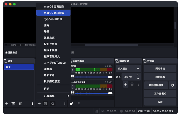OBS Studio 雖然是直播領域的業界標準,但同時也是一款功能強大的免費工具,可在 Mac 上錄製螢幕並同步捕捉系統音訊。與 Audacity 不同的是,最新版本的 OBS 無需安裝額外驅動程式,即可原生錄製 Mac 的系統聲音。