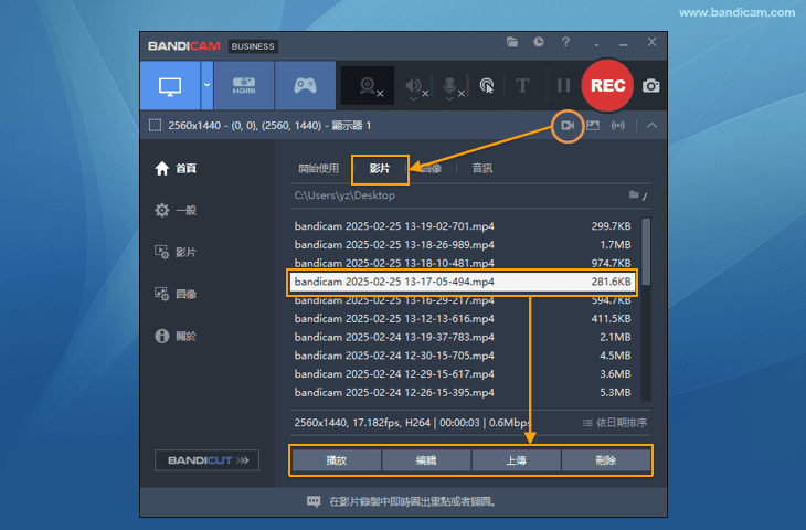 再次按下 REC 按鈕或 F12 鍵即可停止錄製。隨後,點選程式內的影片圖示,您便能播放、編輯已錄製的影片,或直接將其上传至 YouTube、Google Drive 及 Vimeo 等平台。