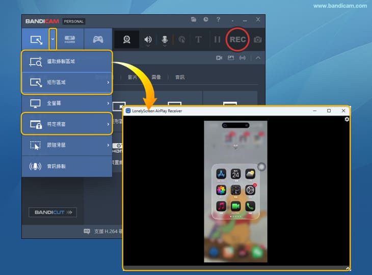 首先,請根據前述說明,使用 LonelyScreen 或 5KPlayer 將您的 iPhone 畫面鏡像到電腦上。 - 下載並安裝 Bandicam