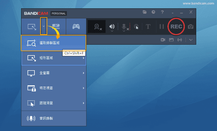 - 啟動 Bandicam,選擇「螢幕錄製模式 → 選取錄製區域」錄製模式。