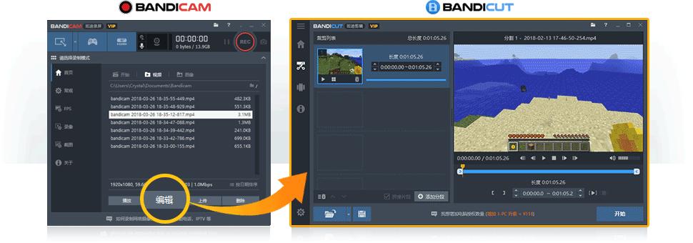 用 Bandicam 錄製的影片需要編輯時,在 Bandicam 首頁選擇要編輯的視頻,然後點擊【編輯】按鈕,則會自動開啟 Bandicut。