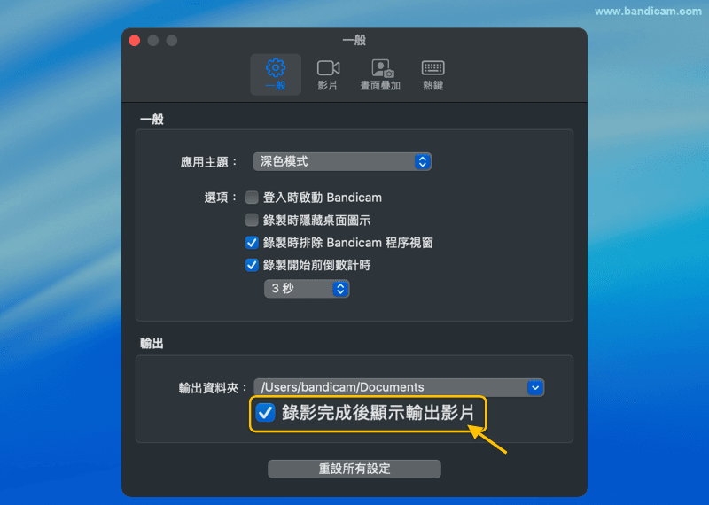 Bandicam macOS 版會將影片保存到您設定的輸出資料夾,若無法在本機找到檔案,可透過以下方法確認: