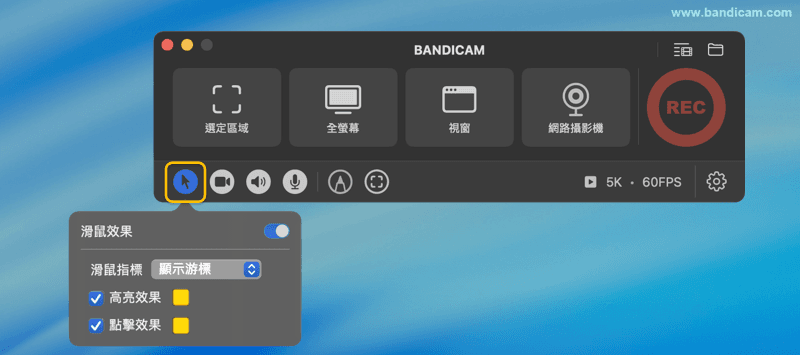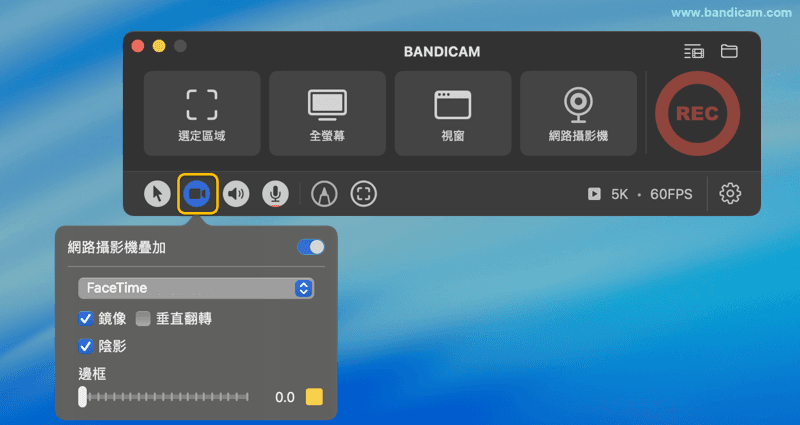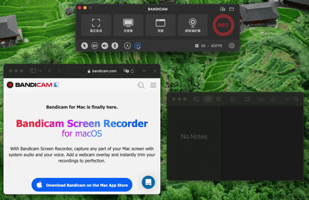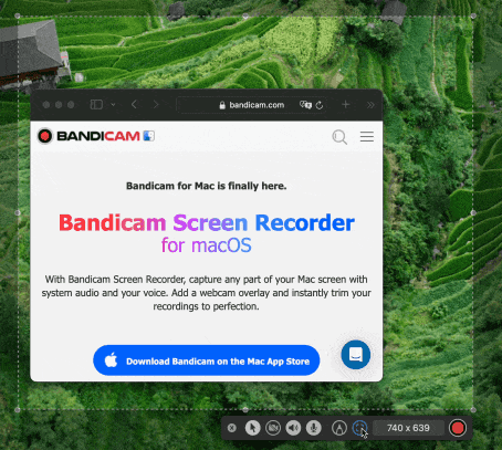 Bandicam macOS 版提供強大的「選定區域」螢幕錄製功能,支援精準捕捉 Mac 螢幕的任意部分,可自訂錄製範圍、調整尺寸與位置,並結合系統音訊、麥克風及攝影機畫面,實現高清、無延遲的專業級錄屏體驗。