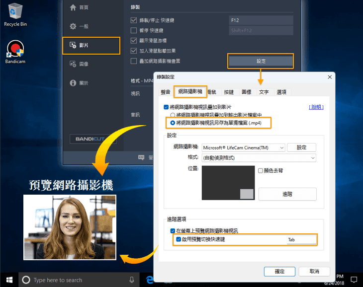 如果您想在錄製網路攝影機時 “打開預覽或關閉預覽”,請選中 “將網路攝影機視訊另存為單獨檔案(MP4)” 選項,然後使用 “啟用預覽切換快捷鍵(Tab )”。